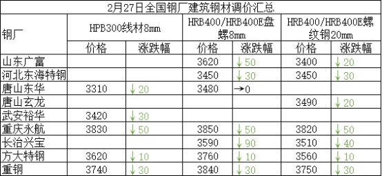 2月27日全国钢厂建筑钢材调价汇总