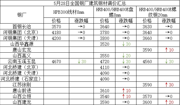5月28日全国钢厂建筑钢材调价汇总