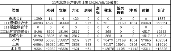 5月下旬,会议召开期间没有利好传出,期市表现平平至周五才借着利好冲击了一波,北京建筑钢材市场价格头弱尾强。市场整体出货一般,虽然刚需支撑下出货没有太差,但高价资源不佳,故本周北京建材库存降幅有所放缓。