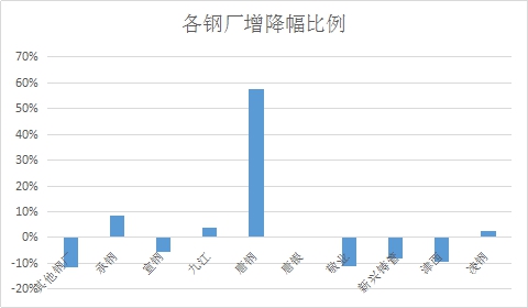 本周各厂资源依旧增减均有。其中,宣钢降幅在6%,敬业降幅在11%,其他钢厂降幅在12%,新兴铸管降幅在8%,津西降幅在10%,承钢增幅在8%,凌钢增幅在2%,九江增幅在4%,唐钢增幅在58%。