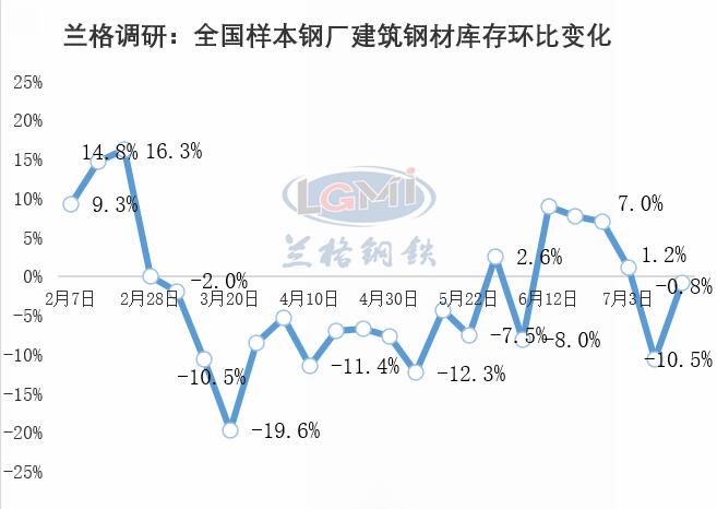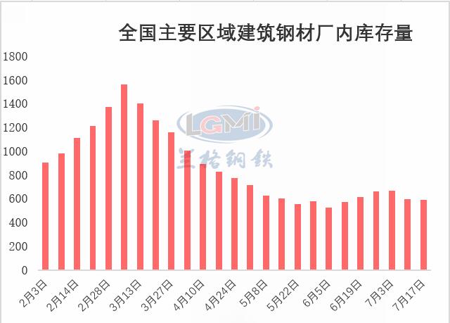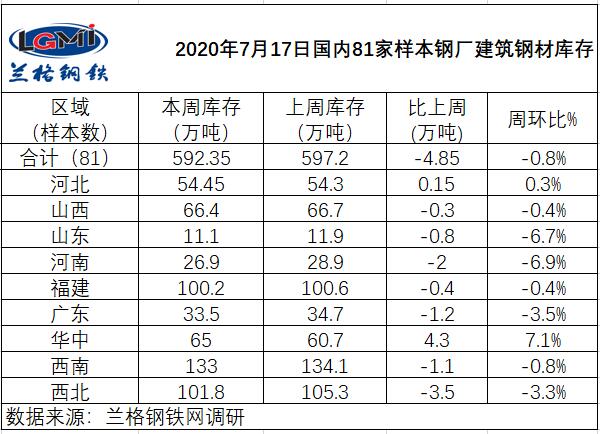 据兰格钢铁网统计,7月17日全国主要地区样本钢厂建筑钢材厂内库存量592.35万吨,比上周五(7月10日)减少4.85万吨,环比减少0.8%;与上周相比降幅明显收窄,华中地区因为近期暴雨原因,库存增幅较快;降幅维持在6-7区间的只有山东与河南地区,上周降幅最快山西、西南地区,本周库存微降。