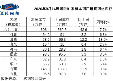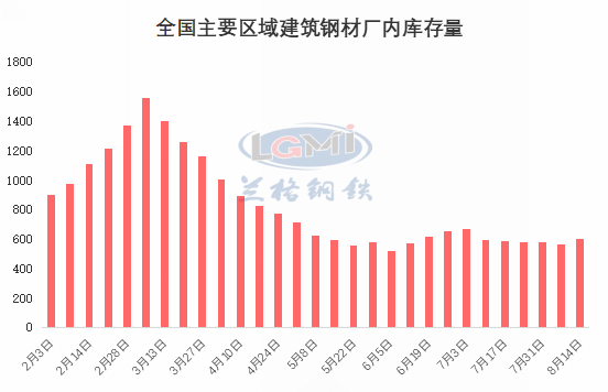 据兰格钢铁网统计,8月14日全国主要地区样本钢厂建筑钢材厂内库存量606.4万吨,比上周五(8月7日)增加43.6万吨,环比增加7.7%;与上周相比库存明显回升,且增幅较为明显。全国地区钢厂库存普遍有不同程度的回升,尤其北方以山西为代表的钢厂因下游商家要货谨慎,及西南分流区域需求因暴雨洪涝遭遇严重打击,故增幅最为明显;而西南本地钢厂也因此库存回升较快。北方入汛南方高温暴雨交错叠加,造成淡季施工需求放缓,钢厂产量居高不下,故预计下周钢厂库存或仍将有所上升。