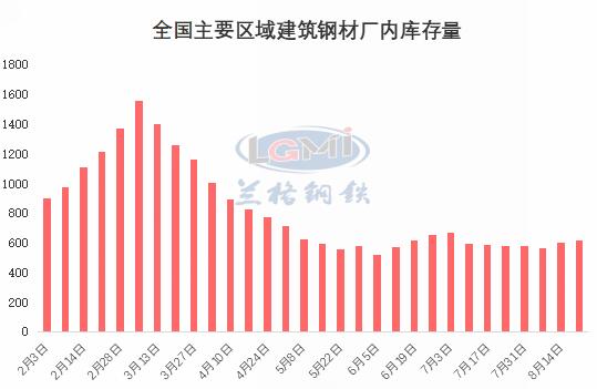 据兰格钢铁网统计,8月21日全国主要地区样本钢厂建筑钢材厂内库存量617.6万吨,比上周五(8月14日)增加11.2万吨,环比增加1.8%;与上周相比库存继续回升,但增速明显放缓。全国地区钢厂库存增多减少,波动幅度均较上周有明显收窄。本周除北京外华北多地遭遇连续强降水,对建材需求影响较大,河北山西钢厂库存继续上升;同时成渝地区暴雨持续钢厂库存继续上升而云南则开始降厂库;另外福建钢厂则因为成交持续低迷,库存压力巨大个别钢厂开始减产,库存增长速度有所放缓。建材利润持续收缩,电炉部分亏损,预计下周钢厂库存上涨势头或继续放缓。