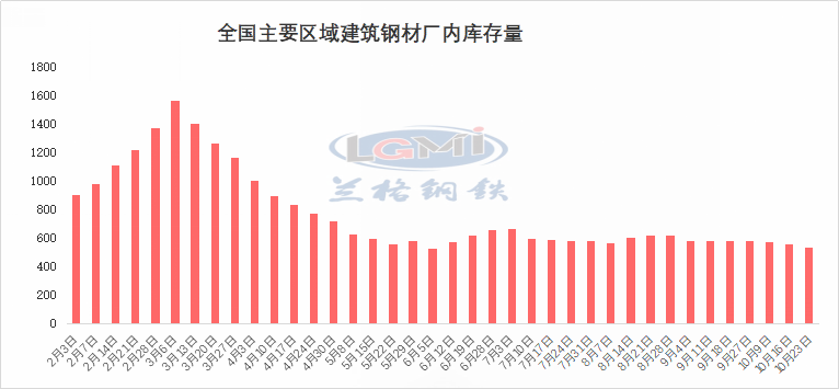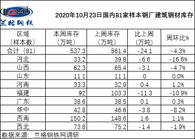 据兰格钢铁网统计,10月23日全国主要地区样本钢厂建筑钢材厂内库存量537.3万吨,比上周(10月16日)减24.1万吨,环比降4.3%;本周钢厂库存普遍下降,福建钢厂减量最大。降库幅度较之前明显加大,具体如下:河北降幅最大为16.6%、福建降幅10.9%,华中山西降幅分别是8.2%和4.7%;其他区域钢厂变化均很小,增减幅几乎忽略不计。本周,伴随需求持续稳定释放及产量供应略有减少,钢厂库存与社会库存持续加速下降。然而随着气温持续下降,北方地区逐步开始出现需求减量,加之下周临近月末,一些价格及资金风险逐步累积,预计下周降库态势或将有所迟滞。