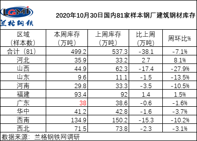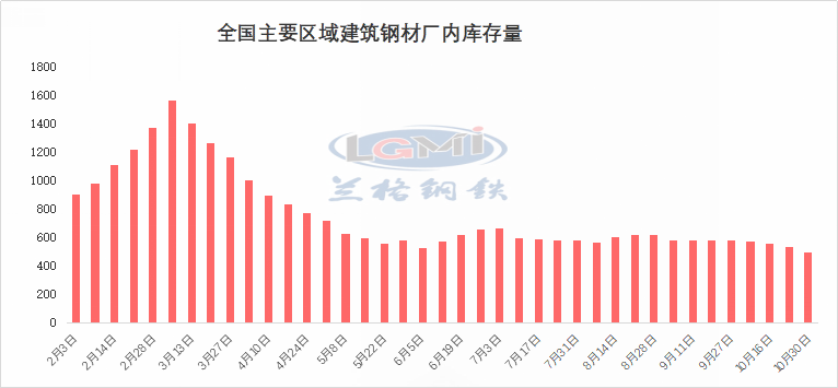 据兰格钢铁网统计,10月30日全国主要地区样本钢厂建筑钢材厂内库存量499.2万吨,比上周(10月23日)减38.1万吨,环比降7.1%;本周钢厂库存普遍都有明显下降,仅有河北和福建微增。其他地区降库速度较之前继续加快,具体如下:山西降幅最大为27.9%、山东河南西南降幅处于同一水平,依次是13.5%、10.5%和10.2%;其他区域钢厂变化均很小,增减幅及变化量可以忽略不计。本周,伴随需求释放不减反增及产量持续稳定收窄,钢厂库存与社会库存再次实现双双下降,往常月底容易出现的成交变缓的情况基本没有出现,而随着下周进入月初,多地多钢厂均有减量计划,如此降库趋势或将继续得到巩固,仍将加速去库。