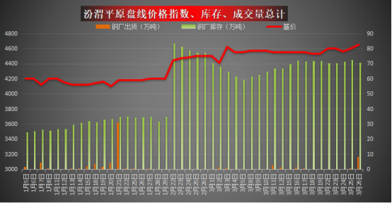 现货方面:今日汾渭平原盘线指数4650,较昨日涨50。由于期货叠加钢坯大涨,市场交投氛围明显好转,低价成交火爆,涨价后出货有所减弱。不过目前钢厂涨价意愿较强,预计明日价格或继续小幅上涨。