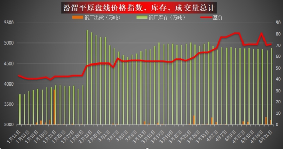 【兰格钢铁】独家实时监测:汾渭平原五家钢厂高线总库存67.8万吨,较昨日增2万吨,开工轧线11条。全天成交4.5万吨,较昨日成交(6.7万吨)减2.2万吨。