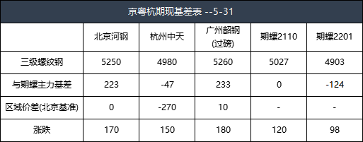 今日广州市场主流价格大幅上涨。目前广州一线5250-5270,二线5170-5200,三线5110-5140(过磅)(单位:元/吨);期螺方面,高开后有一定回落,收盘5027,涨2.45%;原料方面:铁矿石价格大幅上涨,收盘1106,涨5.28%;唐山主流钢坯资源稳,现普碳含税出厂5000元。现货市场方面广州样本户今日成交10200吨,较上个交易日大幅减量。预计后市价格震荡整理。