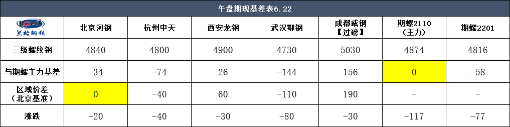 期货部分:22日,螺纹期货2110合约开盘4861夜盘低位运行,来到日盘依然没有明显反弹,午收4874跌117跌幅2.34%,最高4900最低4820减仓1.4万手;热卷走势与螺纹走势基本类似,开盘5115午收5124跌158跌幅2.99%,最高5151最低5070增仓3万手;原料焦炭开盘2615夜盘开盘小幅跳水后明显开始反弹,日盘收盘近乎翻红,午收2657跌13,最高2668.5最低2558.5减仓1.5万手;铁矿石依然继续领跌整个黑色,跌幅略收窄,开盘1121午收1130.5跌40跌幅3.42%,最高1144最低1109.5减仓近3万手;