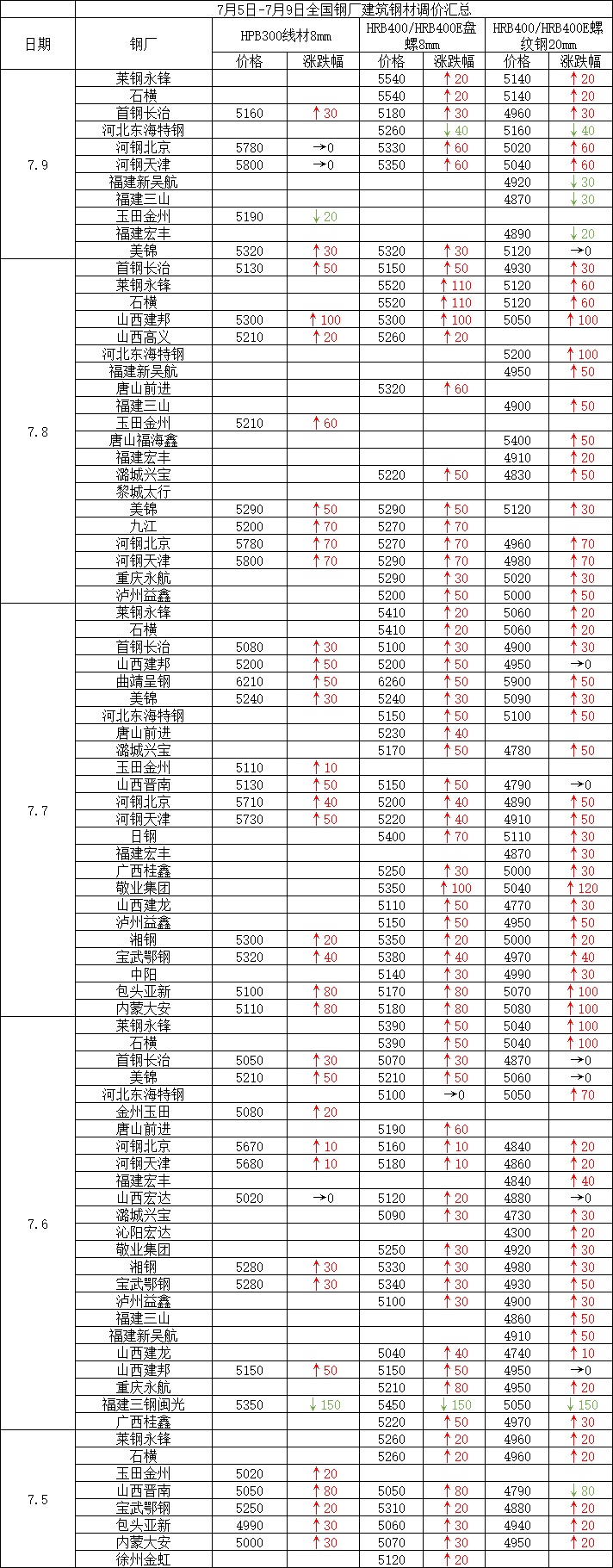 7月5日-7月9日全国钢厂建筑钢材调价汇总