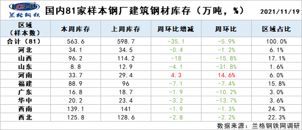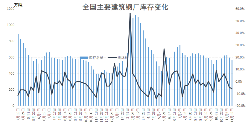 11月19日,全国主要地区样本钢厂建筑钢材厂内库存量563.6万吨,较上周降35.1万吨,降幅5.9%:本周全国近乎一边倒的降库,只有和河南地区逆势增库,增幅14.6%;其他区域具体山东区域降幅31.8%遥遥领先,山西降幅15.8%位列第二,华中区域降幅13.7%位列第三,广东区域降幅10.2%位列第四,其他区域变化不大。本周伴随着期货市场的筑底运行,钢材价格下跌势头有所收敛,然钢厂利润依然倒挂严重,故长材供应依然偏弱。而伴随周中期螺反弹也一度带火了持续低迷的市场,由此有效缓解了厂库压力。而随着社库厂库持续下降,预计后期市场价格或逐渐有所支撑。厂库或有望继续下降,但区域分歧或继续分化。