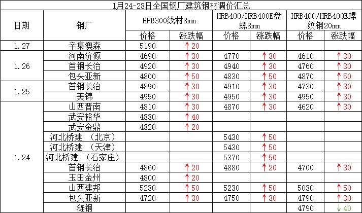 • 1月24-28日全国钢厂建筑钢材调价汇总