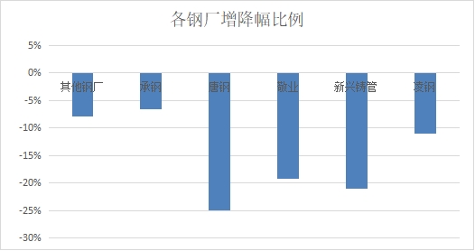 本周各厂资源整体下降,敬业承钢钢厂减量居前,降幅唐钢最大。