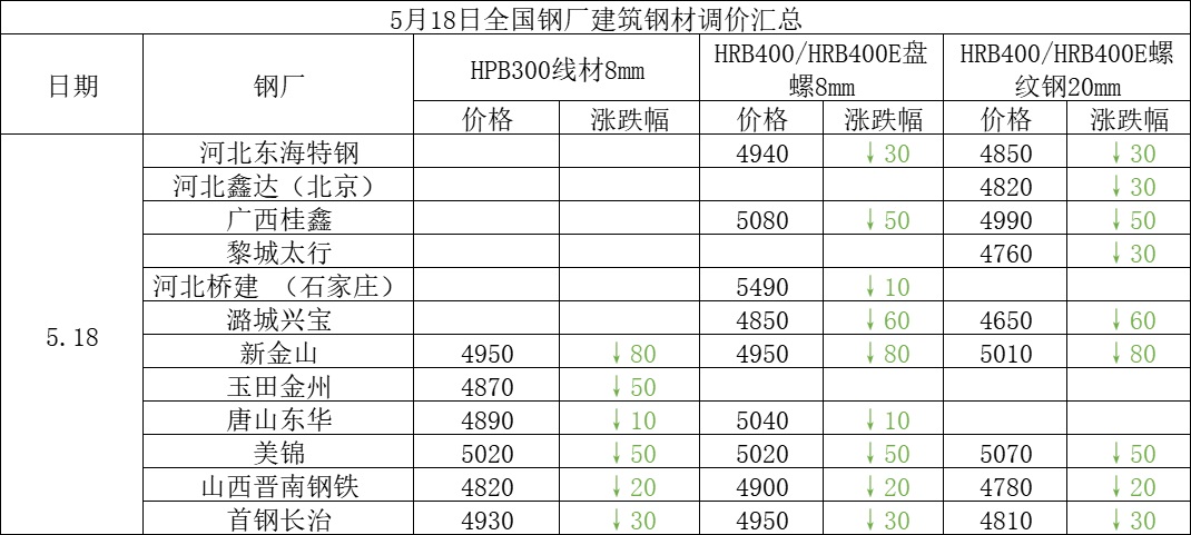 5月18日广西桂鑫钢铁建筑钢材出厂价格下调50元