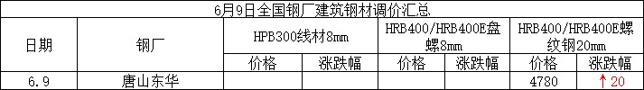 6月9日河北东海特钢建筑钢材出厂价格平稳