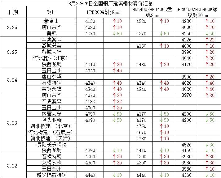 8月22-26日全国钢厂建筑钢材调价汇总