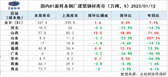 本周,全国主要地区样本钢厂建筑钢材厂内库存量337.4万吨,较上期增1.6万吨,涨幅0.5%,年同比涨7.1%。本周建材厂库增减互现,整体涨幅有所收窄。具体为山西区域涨幅18.8%,涨速明显加快,福建区域涨幅12.1%,保持小幅增长。降库方面,西南区域降幅5.4%,降幅有所扩大,西北区域降幅3.9%,由于供应压力减少,也是由涨转降。本周期螺震荡偏强,市场依然供需两弱,随着春节临近,需求持续下降。供应方面,尽管原料价格下跌,成材价格上涨,钢厂盈利水平有所改善。不过受整体需求约束,产量变化难有明显好转,预计节前钢厂库存将维持小幅增长态势。