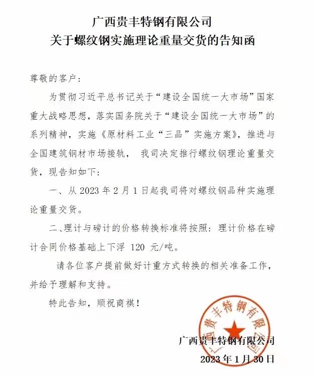 为贯彻习近平总书记关于“建设全国统一大市场”国家重大战略思想,落实国务院关于“建设全国统一大市场”的系列精神,实施《原材料工业“三品”实施方案》,推进与全国建筑钢材市场接轨,我司决定推行螺纹钢理论重量交货,现告知如下: