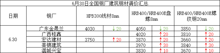 • 6月30日广西桂鑫钢铁建筑钢材出厂价格上调20元