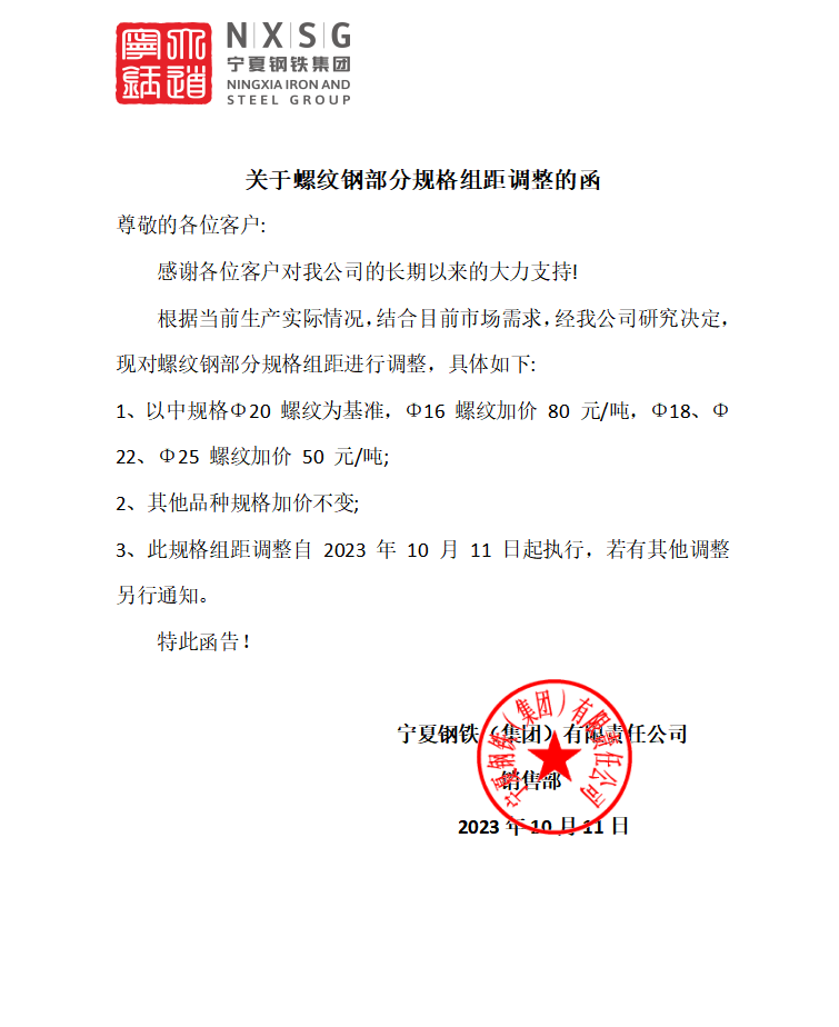 宁钢对螺纹钢部分规格组距进行调整的通知