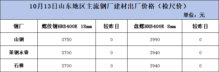 • 10月13日山东地区主流钢厂建材出厂价格全线稳定