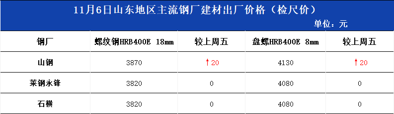 • 11月6日山东地区主流钢厂建材出厂价格