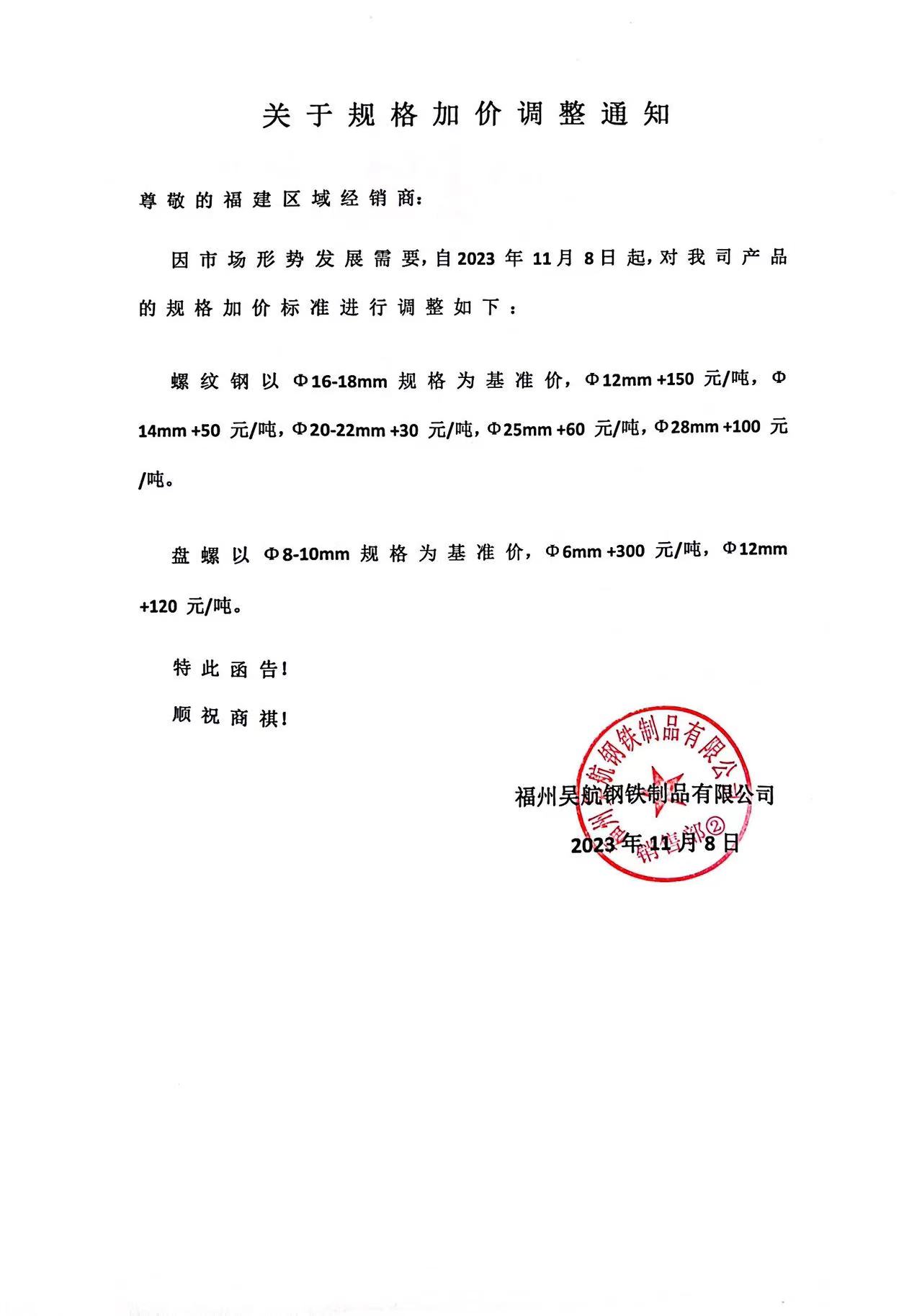 吴航关于螺纹钢规格加价调整通知