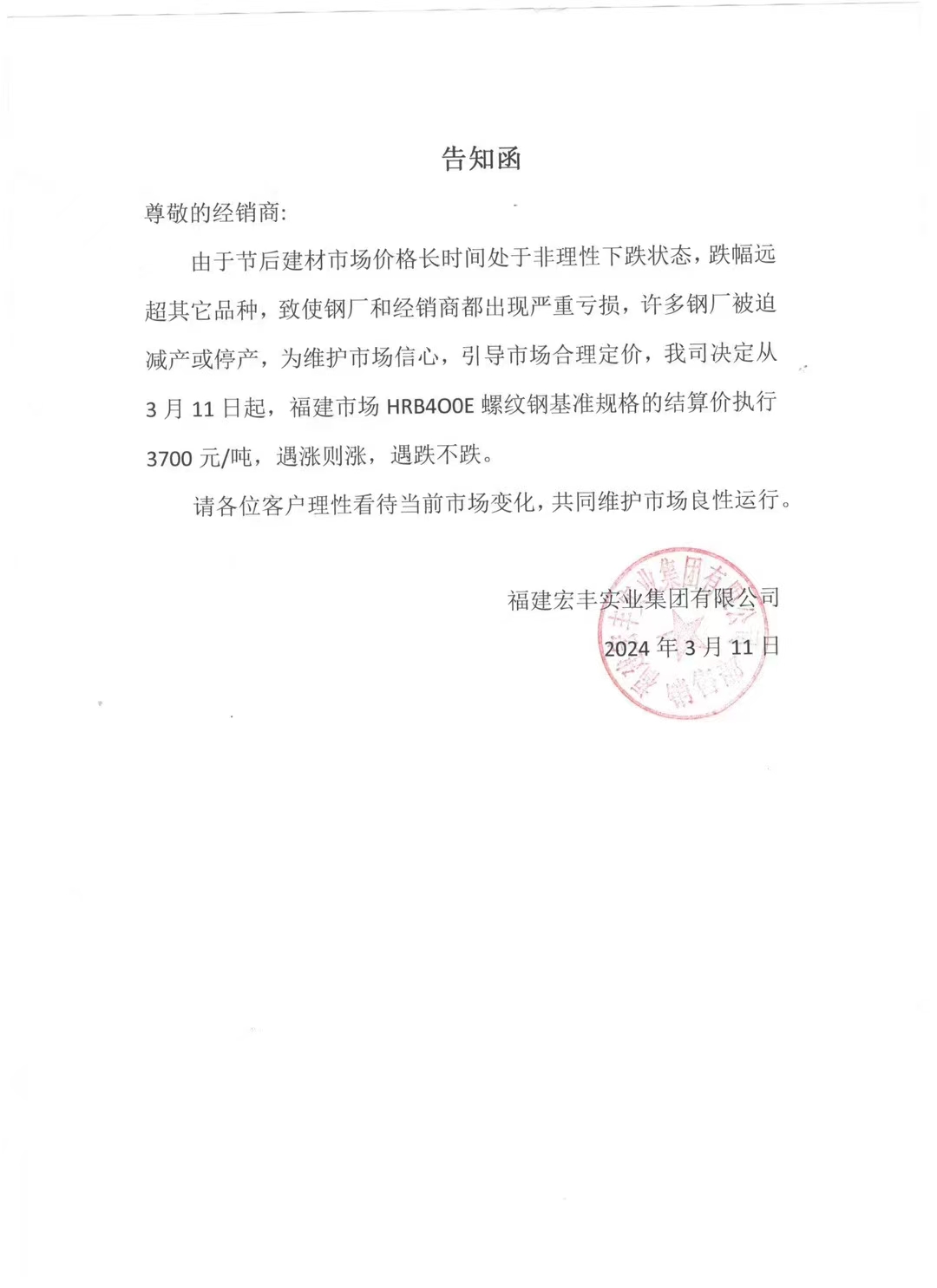 由于节后建材市场价格长时间处于非理性下跌状态,跌幅远超其它品种,致使钢厂和经销商都出现严重亏损,许多钢厂被迫减产或停产,为维护市场信心,引导市场合理定价,我司决定从3月11日起,福建市场HRB400E螺纹钢基准规格的结算价执行3700 元/吨,遇涨则涨,遇跌不跌。