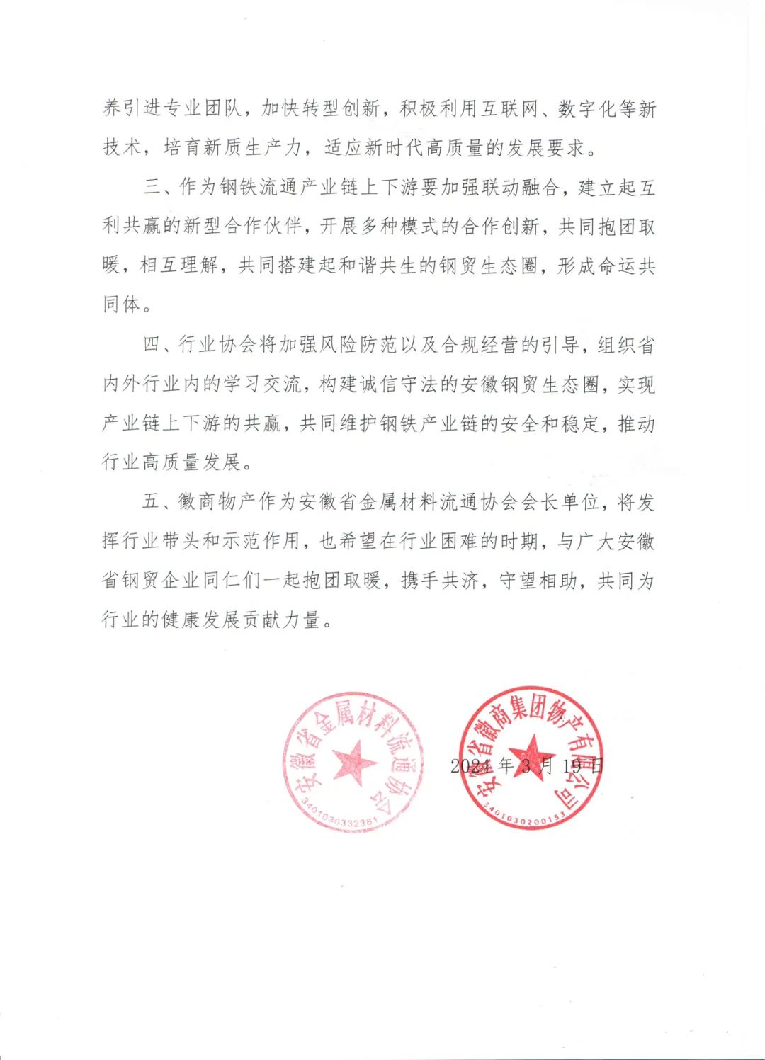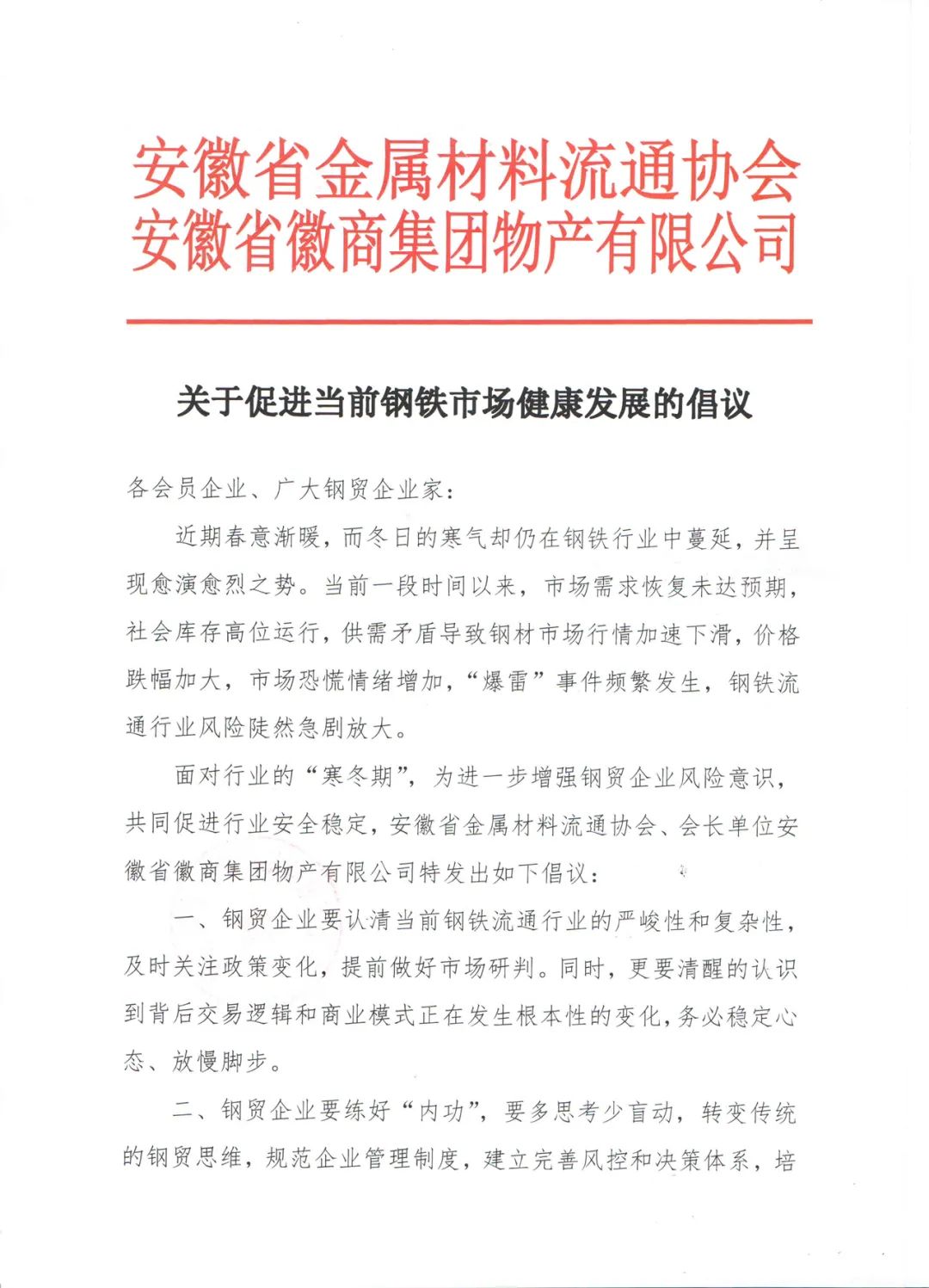 安徽省金属材料流通协会、安徽省徽商集团物产有限公司关于促进当前钢铁市场健康发展的倡议