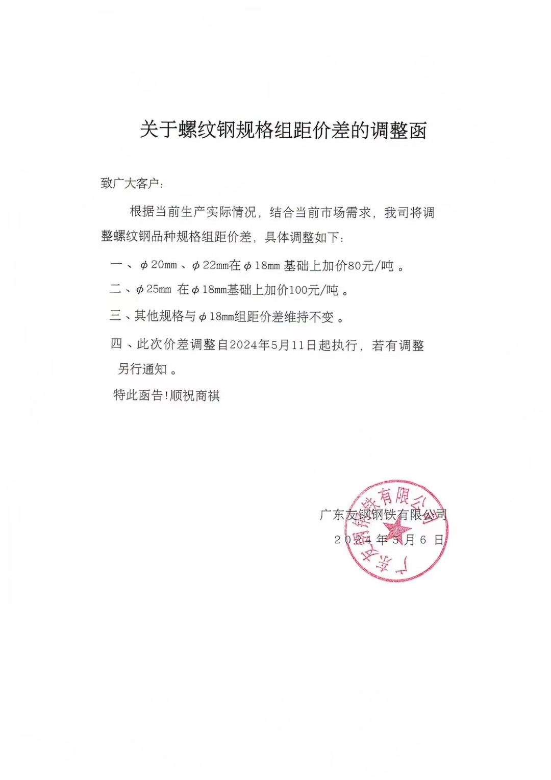快讯:广东友钢钢铁有限公司关于螺纹钢规格组距价差的调整函