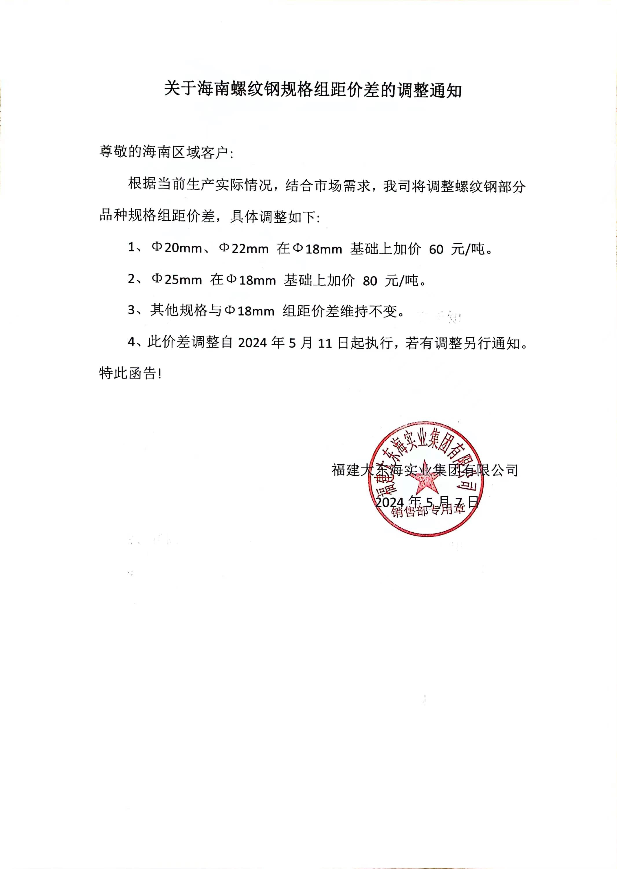 快讯:福建大东海实业集团有限公司关于海南区域螺纹钢规格组距调整的通知