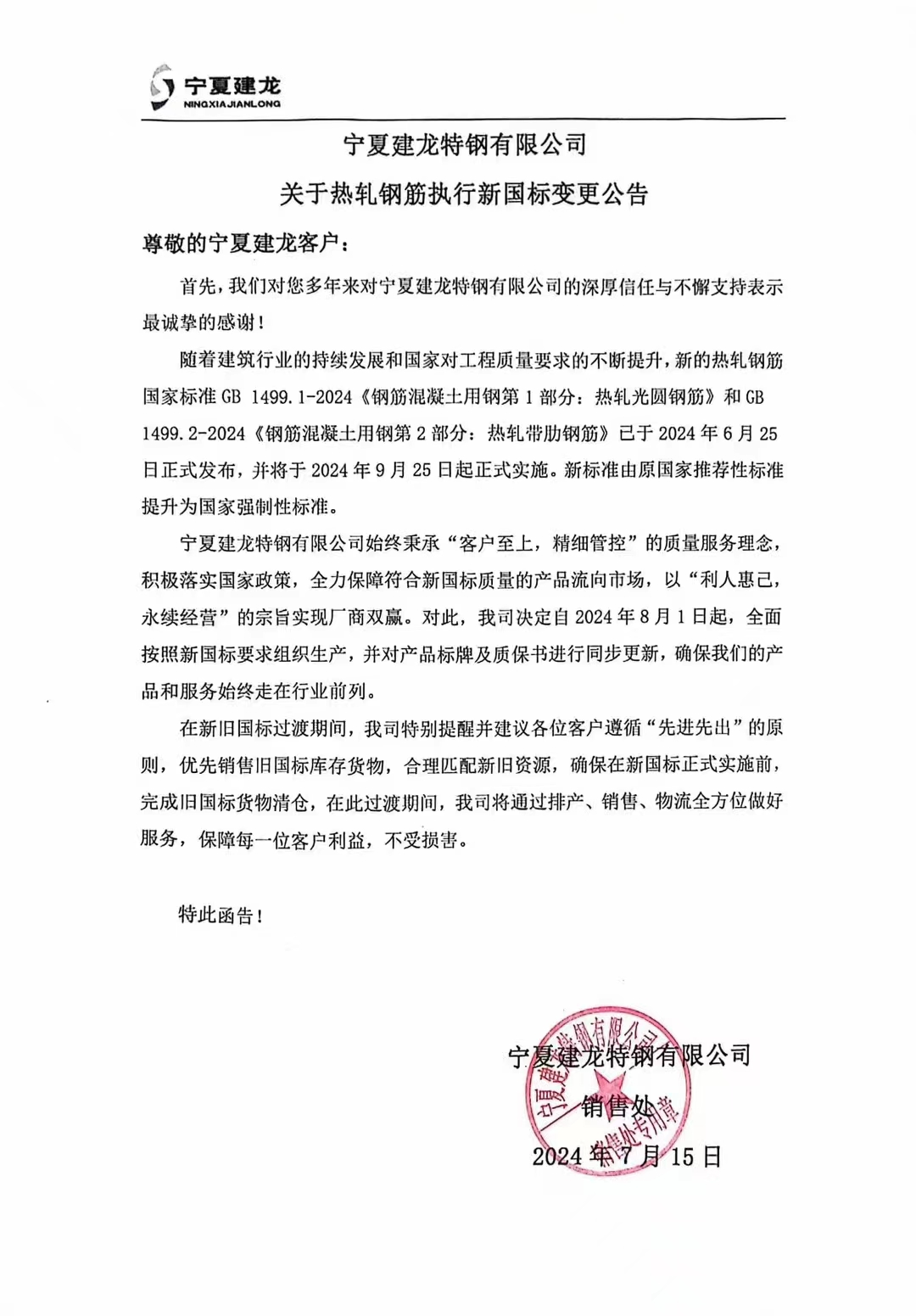 宁夏建龙特钢有限公司关于热轧钢筋执行新国标变更公告