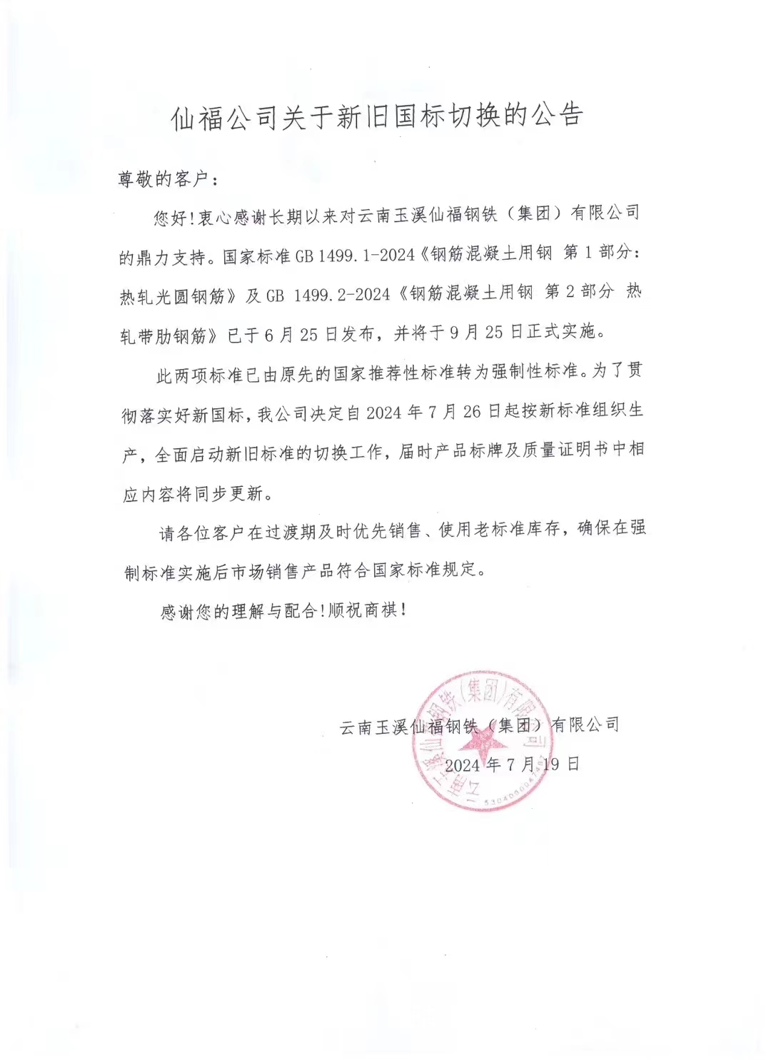 - 仙福公司关于新旧国标切换的公告2024/7/19