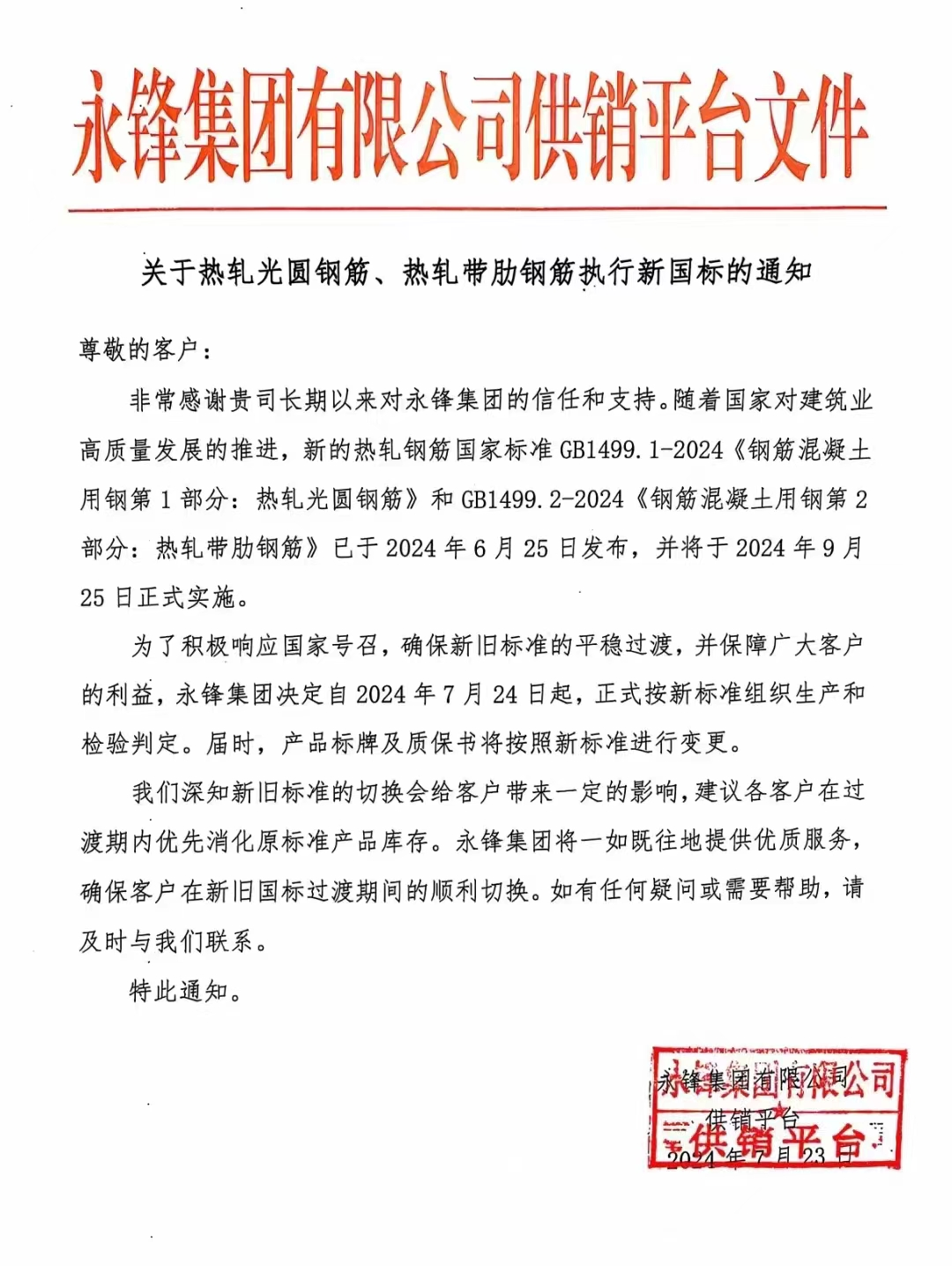- 永锋集团有限公司关于热轧光圆钢筋、热轧带肋钢筋执行新国标的通知2024/7/23