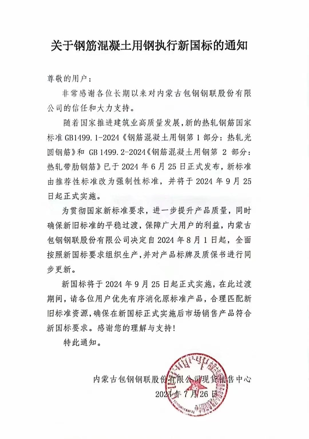 快讯:内蒙古包钢钢联股份有限公司关于钢筋混凝土用钢执行新国标的通知