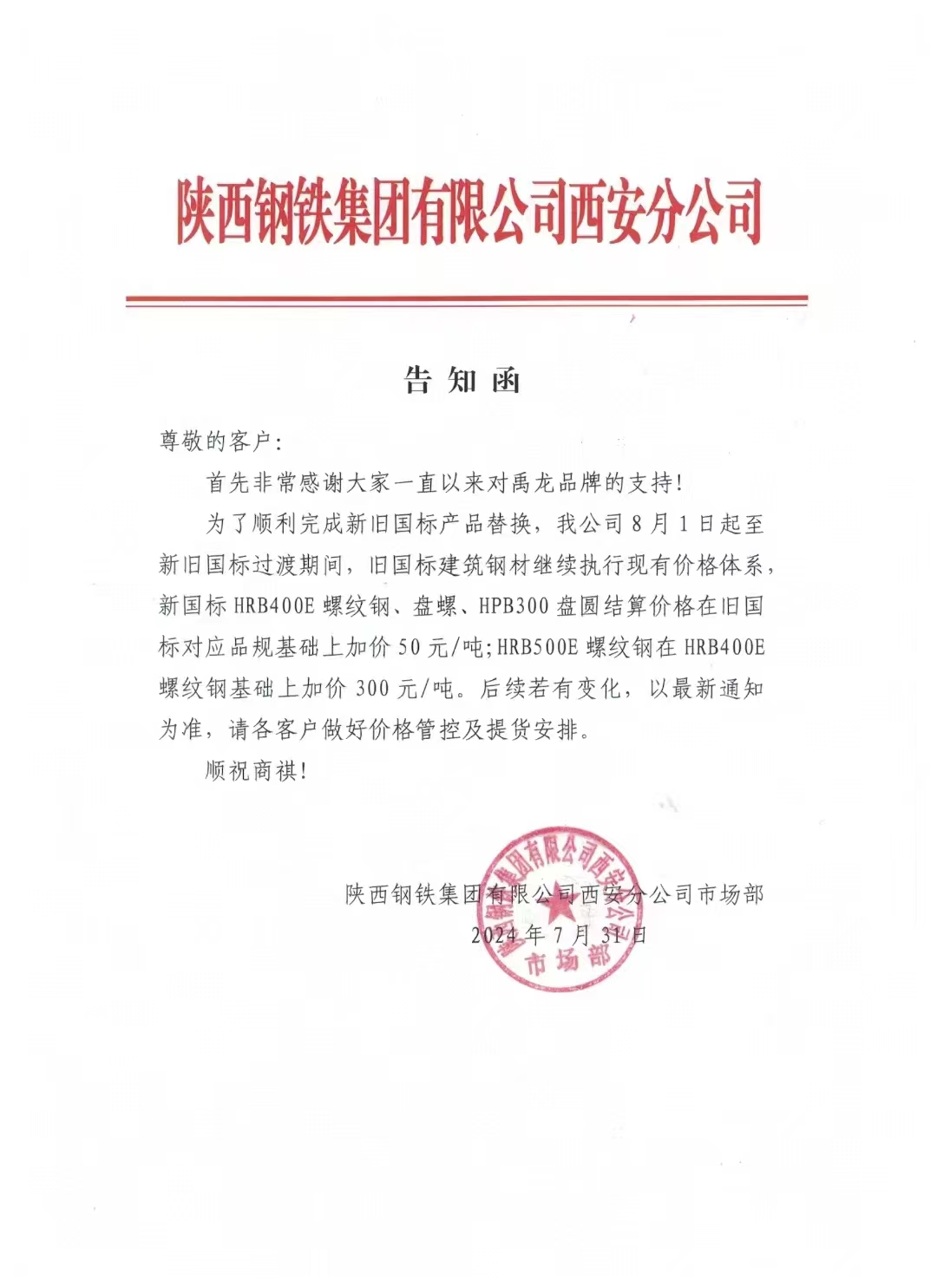 - 陕钢集团西安分公司关于新国标建材结算价的告知函2024/7/31