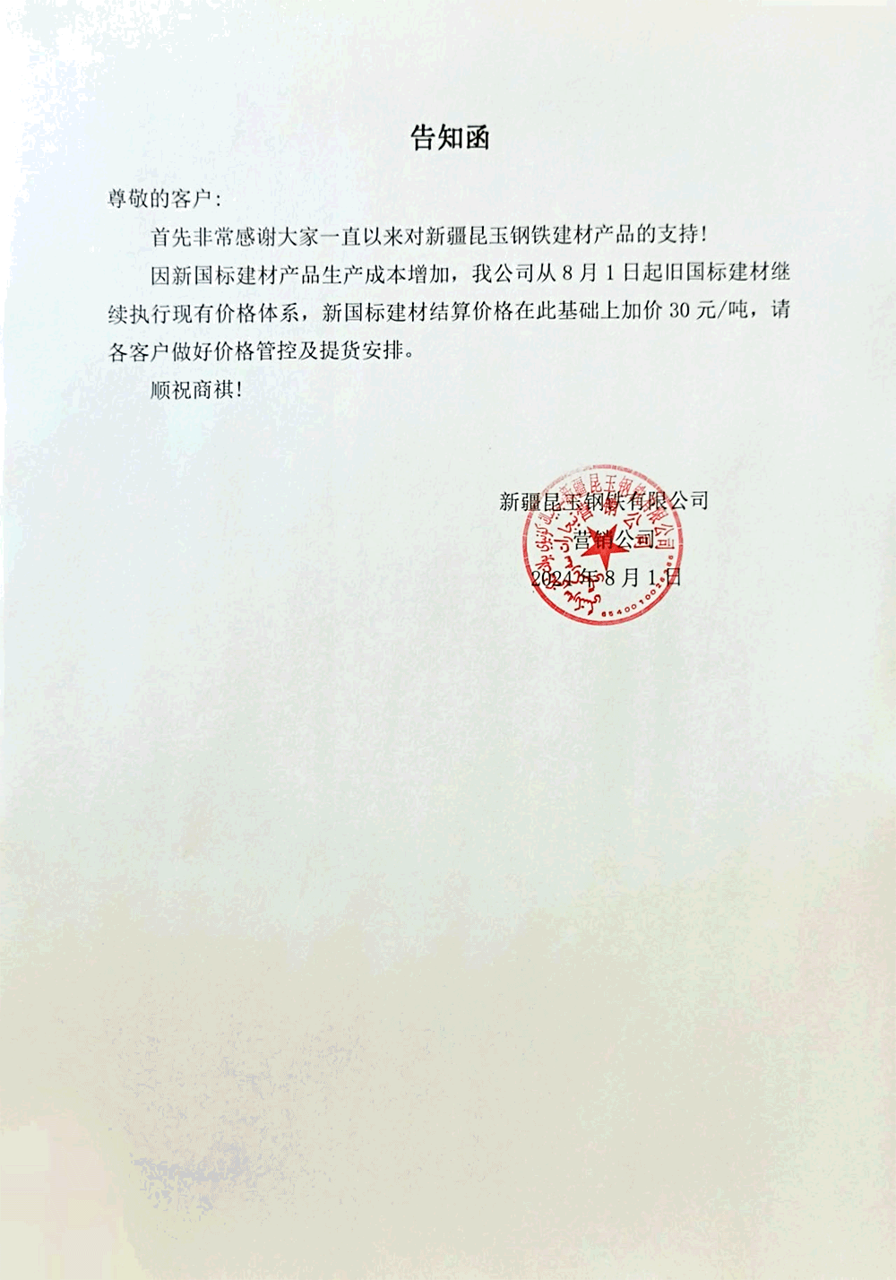 - 新疆昆玉钢铁新国标建材结算价的告知函2024/8/1