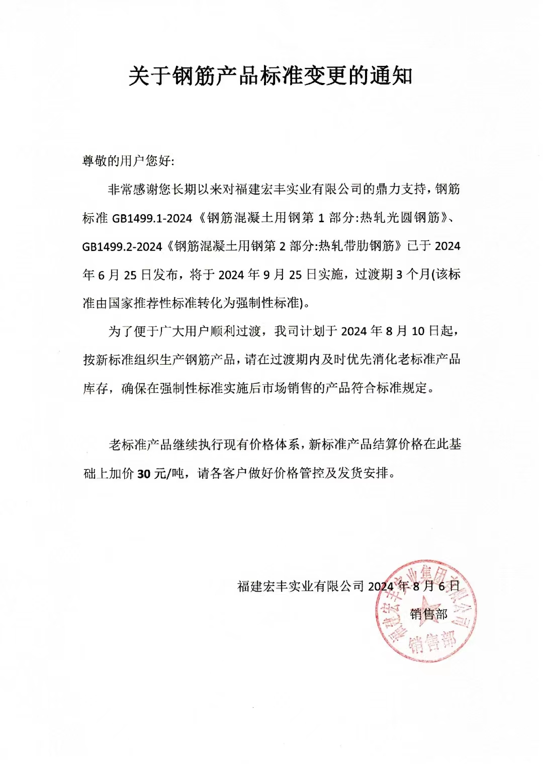 非常感谢您长期以来对福建宏丰实业有限公司的鼎力支持,钢筋标准GB1499.1-2024《钢筋混凝土用钢第1部分:热轧光圆钢筋》、GB1499.2-2024《钢筋混凝土用钢第2部分:热轧带肋钢筋》已于 2024年6月25日发布,将于2024年9月25日实施,过渡期3个月(该标准由国家推荐性标准转化为强制性标准)。