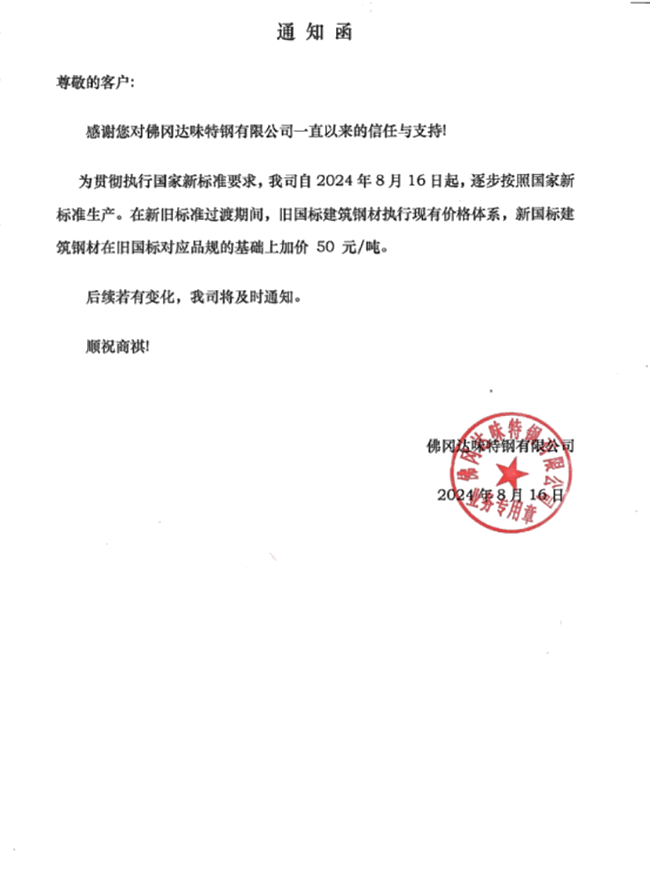 为贯彻执行国家新标准要求,我司自2024年8月16日起,逐步按照国家新标准生产。在新旧标准过渡期间,旧国标建筑钢材执行现有价格体系,新国标建筑钢材在旧国标对应品规的基础上加价50元/吨。