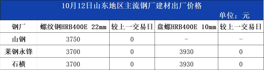 • 10月12日山东地区主流钢厂建材出厂价格
