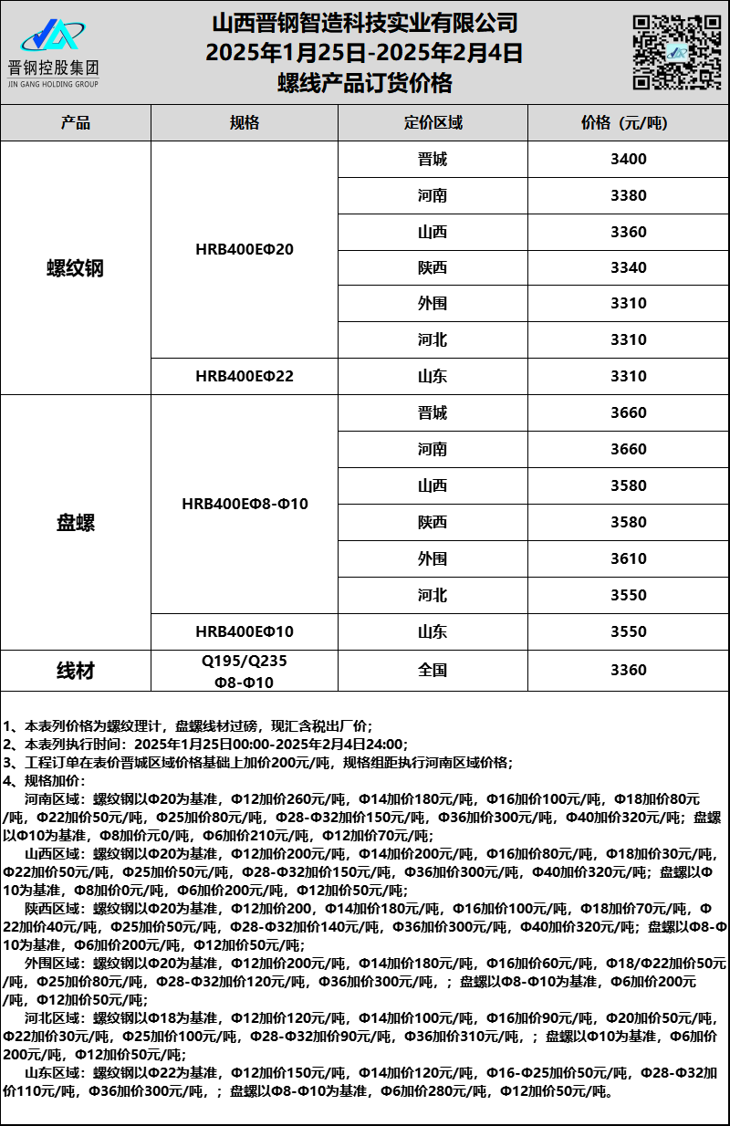1月25日-2月4日山西晋钢建筑钢材订货价格