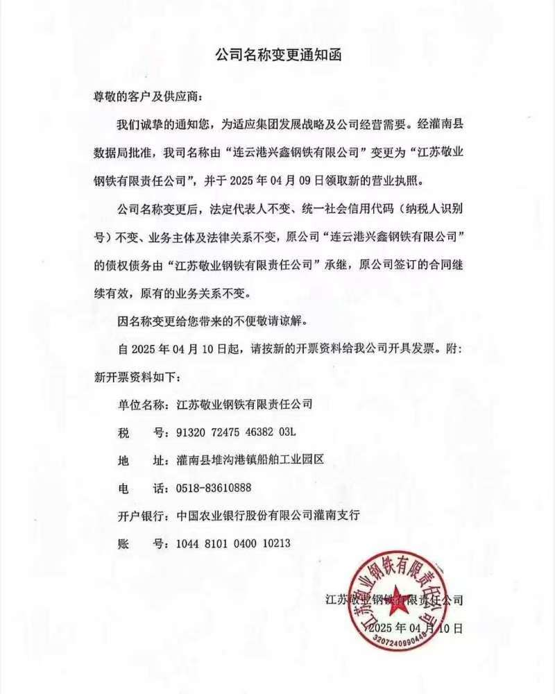 快讯:连云港兴鑫钢铁有限公司名称变更公告