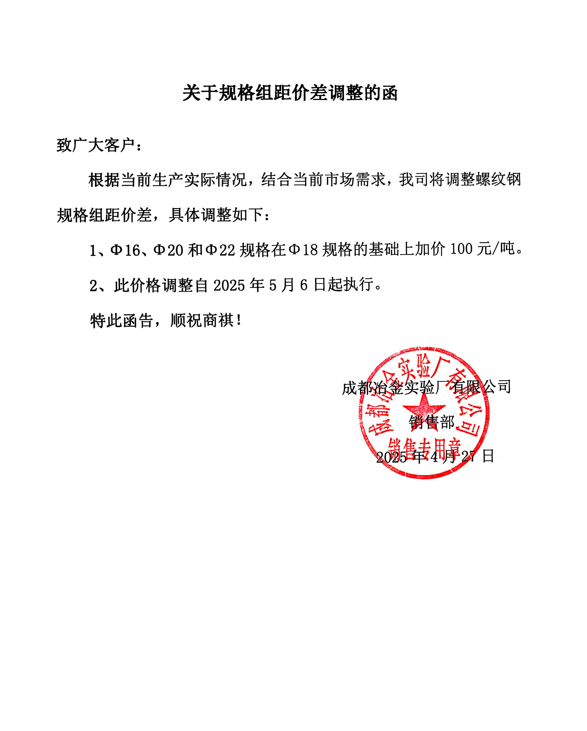 - 成实冶金实验厂关于规格组距价差调整的通知2025/4/27