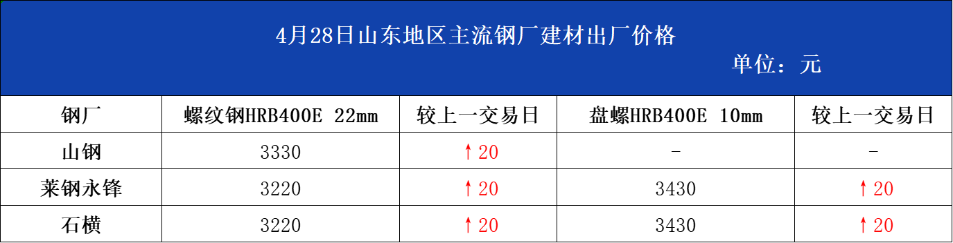 • 4月27日唐山东华建筑钢材出厂价格上调20元
