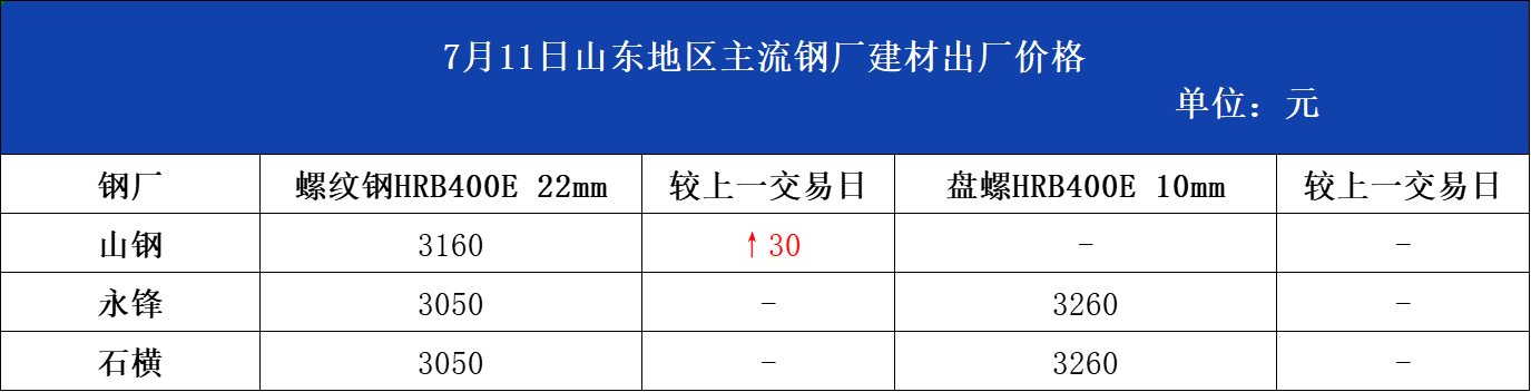 • 7月10日(14:00)山东地区主流钢厂建材出厂价格