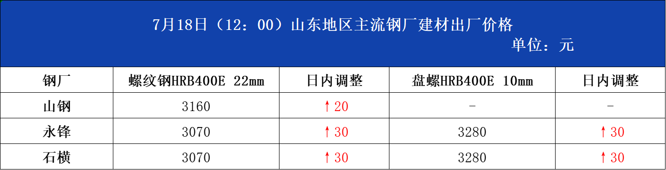 • 7月18日(12:00)山东地区主流钢厂建材出厂价格