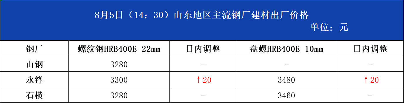 • 8月5日(14:30)山东地区主流钢厂建材出厂价格