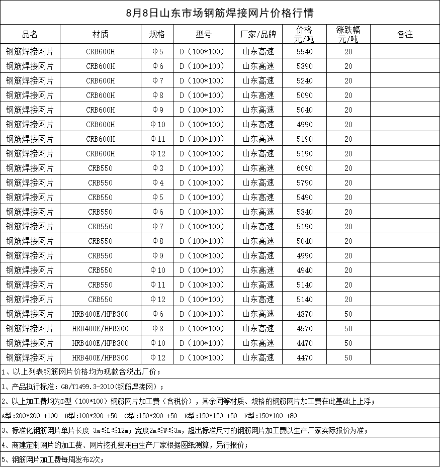 8月8日山东市场钢筋焊接网片价格行情
