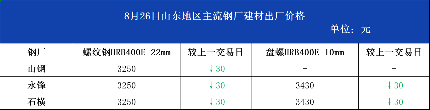 • 8月26日山东地区主流钢厂建材出厂价格