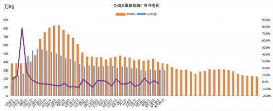 本周,全国主要地区样本钢厂建筑钢材的厂内库存量302.8万吨,相较于上期减少7.2万吨,降幅为2.3%,和去年同期相比降幅18.8%。供应端方面,国内钢厂生产活动继续保持谨慎收缩的态势。由于近期成材价格持续在成本线附近徘徊,部分钢厂亏损压力加剧,主动减产检修的意愿较强。高炉和电炉的开工率均维持在相对低位,导致螺纹钢和线材等建筑钢材的总体供应量环比有所下滑,供给端对市场的压力较前期略有缓解,但绝对水平仍处高位,并未形成强有力的支撑。库存维度,仅山东、河南及广东地区呈现增库态势,整体降库为主。需求端持续疲软,临近“金九银十”旺季却无明显起色。下游项目资金到位差,施工慢,新增采购有限;多地高温降雨制约户外施工,进一步拖累钢材消化,刚需乏力成价格上行核心阻力。市场方面,本周现货价震荡运行、重心小幅下移。周初受宏观利好短暂拉涨,但缺需求支撑很快冲高回落。全周成交平淡,仅价格下调时偶现低价投机需求,且持续性差,区域价差稳定,资源跨区域流动弱。贸易商心态偏谨慎悲观,对“旺季不旺”预期下,囤货意愿低,以积极出货降库存避风险为主。虽期待后续稳增长政策,但需求未实质好转前信心难恢复,多数维持快进快出短线操作。综合来说,预计下周钢厂库存小幅降库趋势。